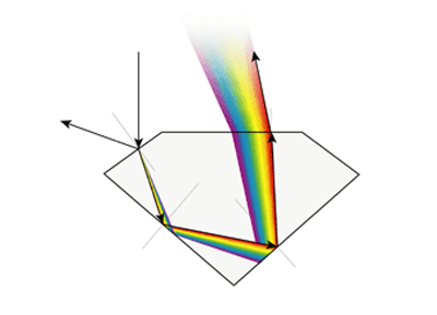 Though extremely difficult to analyse or quantify, the cut of any diamond has three attributes: brilliance (the total light reflected from a diamond), fire (the dispersion of light into the colours of the spectrum), and scintillation (the pattern of light and dark areas and the flashes of light, or sparkle, when a diamond, or the light source or the observer moves).
